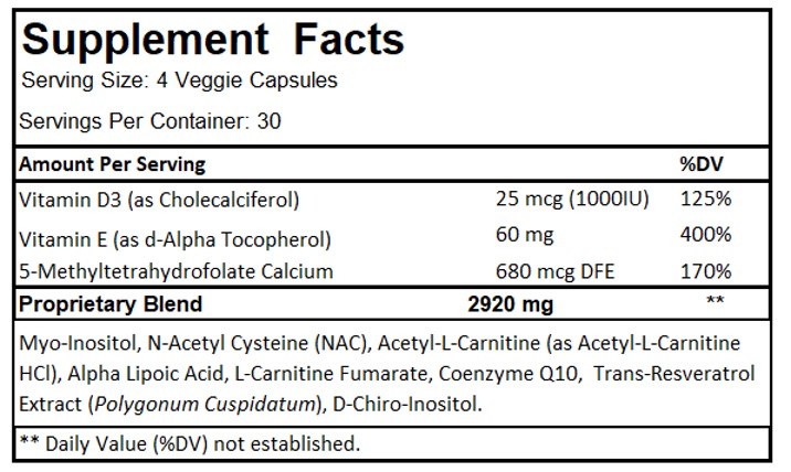 - Antioxidant Protection: CoQ10, Trans-Resveratrol, Alpha Lipoic Acid, and Acetyl-L-Carnitine provide potent antioxidant effects, protecting eggs from oxidative damage and improving ovarian function.